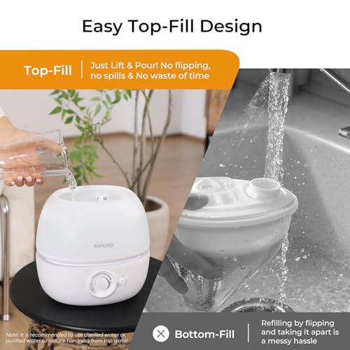 𝙊𝙣𝙚 𝙎𝙩𝙚𝙥 𝙏𝙤𝙥-𝙁𝙞𝙡𝙡: Just lift and pour water through top large opening! Filling the tank within seconds. No need to turn over the water tank and no more spills or wet floor. Easily enjoy the soothing cool mist with BOXING humidfier