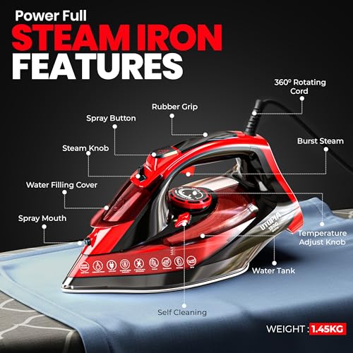 Specification: Utopia Home Steam Iron for Clothes – Non-Stick Soleplate – 1800W Clothes Iron With Auto-Off Safety Feature – Adjustable Thermostat Control, Variable Steam Control, Self-Clean, 8 Feet Cord (Black/Red)