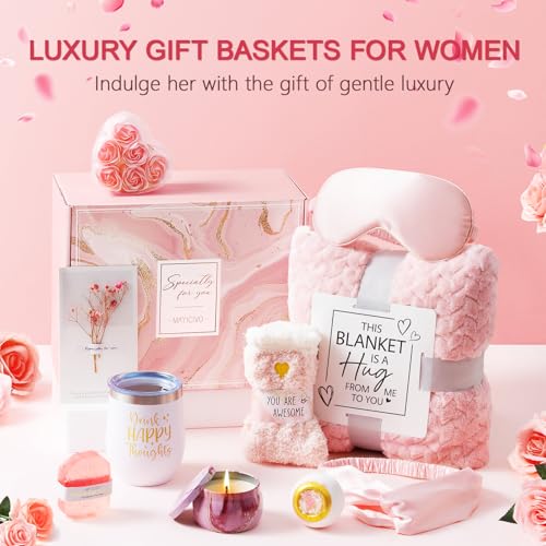 11PCS SELF CARE GIFTS FOR WOMEN: MAYICIVO Spa Gifts Box Pink Gifts for Women contains all carefully-designed thoughtful goodies, including luxury flannel blanket,12oz insulated tumbler, 4oz rose scented candle, handmade soap, bath bomb, floral-scented soap, silk eye mask, silk headband, fuzzy socks, dried flower gift card and elegant gift box. Such a heart-warming Gifts for Women Birthday Unique! Send this spa gifts for women to let her enjoy a cozy & leisure time
